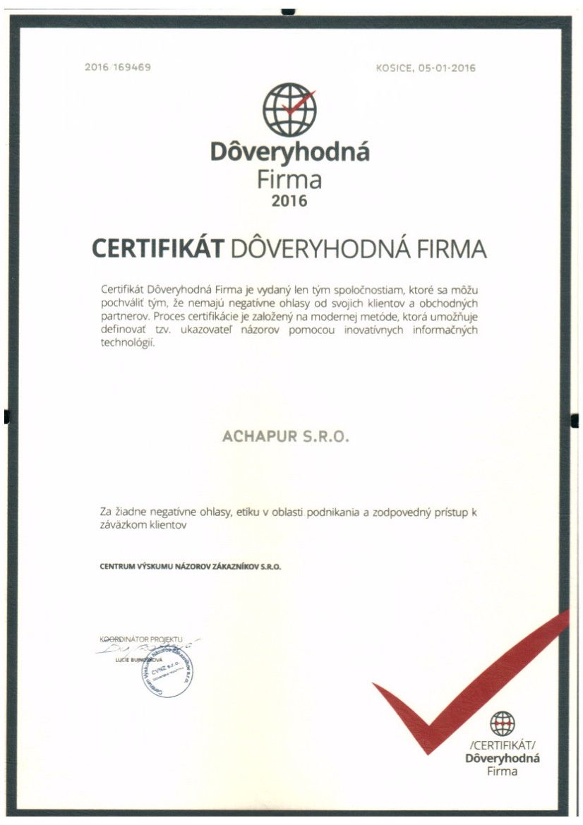 Naša snaha o kvalitu práce a spokojnosť zákazníkov bola odmenená získaním certifikátu pre dôveryhodnú firmu: